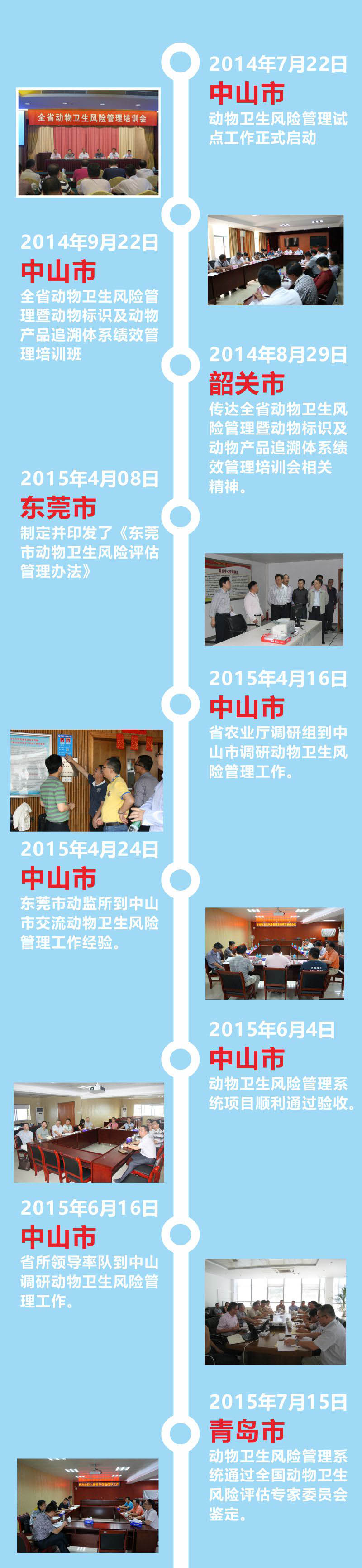 2014年動(dòng)物衛(wèi)生風(fēng)險(xiǎn)管理試點(diǎn)工作在中山市正式啟動(dòng),隨后在廣東省動(dòng)物衛(wèi)生監(jiān)督所的帶領(lǐng)下,東莞、韶關(guān)、河源、惠州、陽江、清遠(yuǎn)和雷州等地市相繼開展試點(diǎn)工作,組織執(zhí)法人員參加風(fēng)險(xiǎn)管理培訓(xùn)班。2015年動(dòng)物衛(wèi)生風(fēng)險(xiǎn)管理系統(tǒng)在青島市通過全國動(dòng)物衛(wèi)生風(fēng)險(xiǎn)評估專家委員會(huì)的鑒定。短短兩年時(shí)間內(nèi),動(dòng)物衛(wèi)生風(fēng)險(xiǎn)管理試點(diǎn)遍布廣東省內(nèi) 8個(gè)地市。這充分說明動(dòng)物衛(wèi)生風(fēng)險(xiǎn)管理系統(tǒng)的應(yīng)用推廣取得了階段性的成功。廣東省農(nóng)業(yè)廳和廣東省動(dòng)物衛(wèi)生監(jiān)督所對此給予了高度肯定,并表示,動(dòng)物衛(wèi)生風(fēng)險(xiǎn)管理系統(tǒng)的建立有效提高了工作效率,降低了行政成本,提升了物衛(wèi)生的風(fēng)險(xiǎn)控制能力和監(jiān)督管理水平,應(yīng)該在全省范圍內(nèi)推廣。