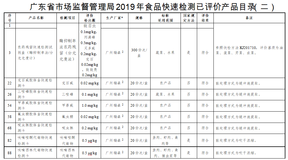由廣東省市場監(jiān)督管理局組織廣東省食品檢驗(yàn)所開展的快速檢測產(chǎn)品現(xiàn)場驗(yàn)證活動,于近日公布結(jié)果。廣州瑞森生物科技股份有限公司參與的克百威快速檢測卡、甲萘威快速檢測卡以啶蟲脒快速檢測卡等11種快檢產(chǎn)品通過現(xiàn)場驗(yàn)證。