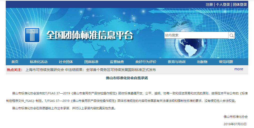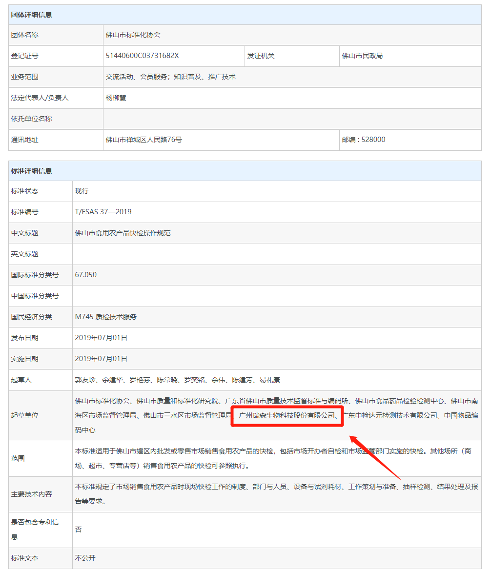 瑞森生物參與制定的T/FSAS 37—2019《佛山市食用農(nóng)產(chǎn)品快檢操作規(guī)范》團(tuán)體標(biāo)準(zhǔn)于2019年7月1日在全國(guó)團(tuán)體標(biāo)準(zhǔn)信息平臺(tái)發(fā)布公示。
