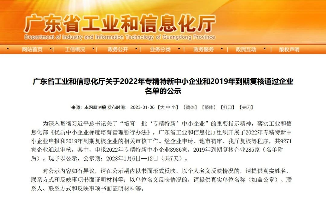 為了深入貫徹習近平總書記關于”培育一批專精特新中小企業(yè)“的重要指示精神,落實工業(yè)和信息化部《優(yōu)質中小企業(yè)梯度培育管理暫行辦法》(工信部企業(yè)〔2022〕63號,廣東省工業(yè)和信息化廳開展2022年專精特新中小企業(yè)申報與到期復核相關審核工作,制定了《優(yōu)質中小企業(yè)梯度培育管理實施方案(2022年版)》,并于2022年8月組織開展了2022年創(chuàng)新型中小企業(yè)評價、專精特新中小企業(yè)認定和復核工作。