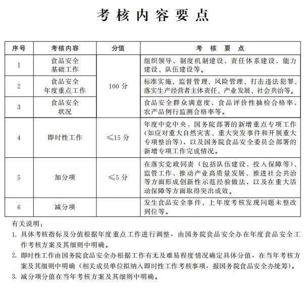 第五條 考核內容主要包括食品安全基礎工作推進、年度重點工作落實、食品安全狀況等,同時設置即時性工作評價和加減分項(考核內容要點見附件)。具體考核指標及分值在年度食品安全工作考核方案及其細則中明確,設置要科學合理,可操作、可評價、可區(qū)分,切實減輕基層負擔。