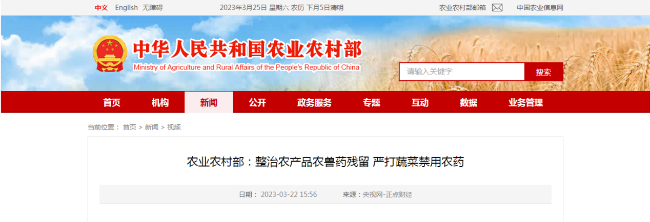 3月21日, 農(nóng)業(yè)農(nóng)村部 ”2023年全國農(nóng)產(chǎn)品質(zhì)量安全監(jiān)管工作會議“在云南省昆明市召開。會議表示,針對一些農(nóng)產(chǎn)品農(nóng)獸藥殘留方面的突出問題將在嚴打蔬菜禁用農(nóng)藥源頭上下功夫。據(jù)介紹,2022年全國農(nóng)產(chǎn)品監(jiān)測合格率達到97.6%,農(nóng)產(chǎn)品質(zhì)量安全形勢持續(xù)向好。但是,農(nóng)產(chǎn)品質(zhì)量安全隱患依然不少,禁用藥物的違法使用雖有下降但并未杜絕,防止常規(guī)農(nóng)藥超標成為新時期的重要任務。