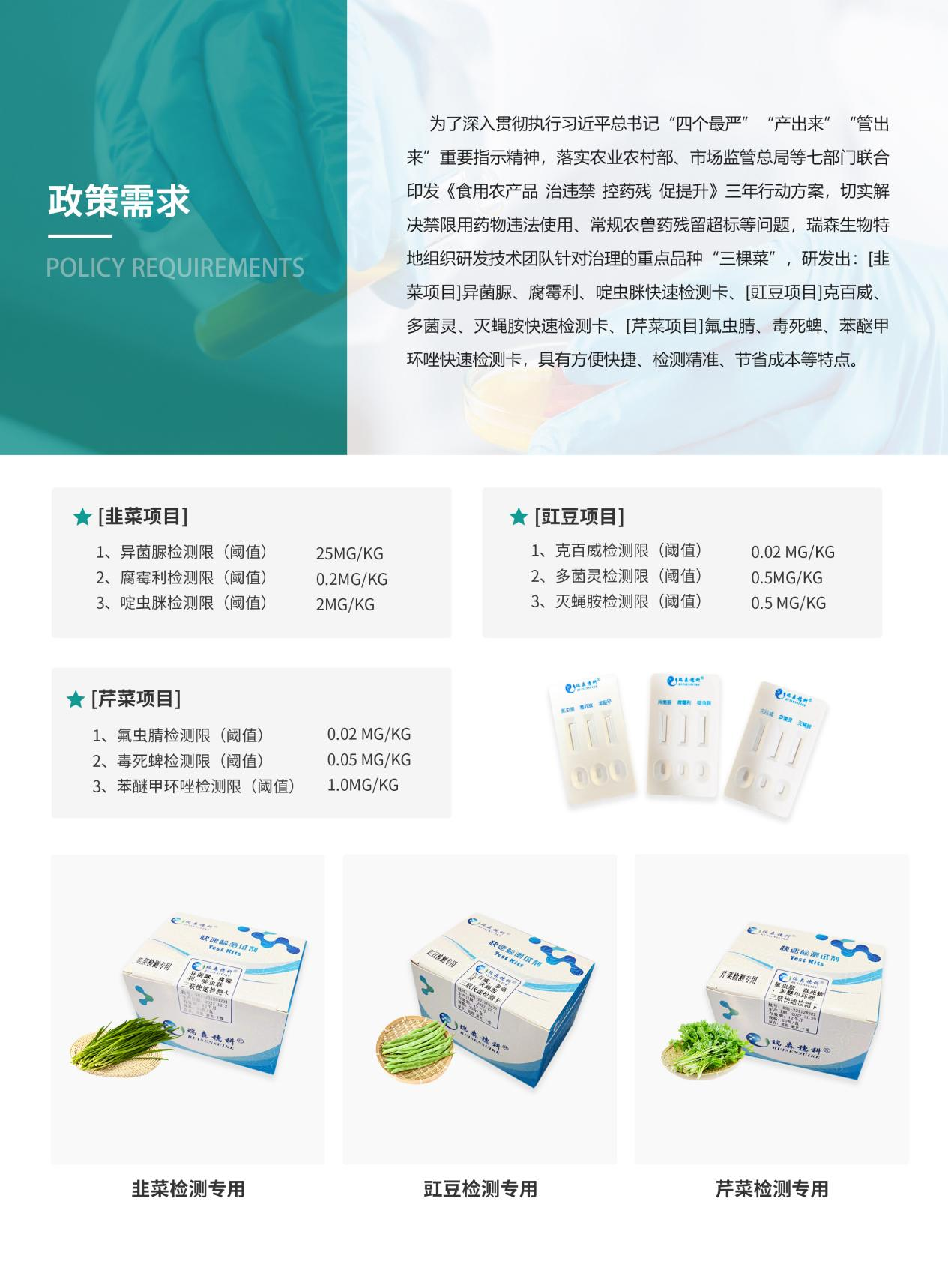 瑞森生物認真學習和貫徹農(nóng)業(yè)農(nóng)村部2023年全國農(nóng)產(chǎn)品質(zhì)量安全監(jiān)管工作會議精神,積極擁護和響應《中華人民共和國食品安全法》。早在2021年國家農(nóng)業(yè)農(nóng)村部發(fā)布了《食用農(nóng)產(chǎn)品“治違禁 控藥殘 促提升”三年行動方案》的通知后,瑞森生物就積極擁護和響應文件精神,并針對《方案》中提到的需要重點治理的11種農(nóng)產(chǎn)品:“三棵菜”、“一枚蛋”、“一只雞”、”肉牛肉羊“、“四條魚”,推出了相關(guān)的新品應對方案,包括”農(nóng)藥殘留膠體金多聯(lián)檢測產(chǎn)品系列“、”禽蛋藥殘專項檢測解決方案“、”熒光定量快速檢測產(chǎn)品“等相關(guān)技術(shù)領先的新型檢測產(chǎn)品。有效解決了國家食用農(nóng)產(chǎn)品存在的安全隱患問題,充分保障了老百姓”菜籃子“上的安全。