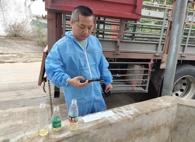 為解決養(yǎng)殖場(chǎng)戶的跑腿問(wèn)題,湛江市的官方獸醫(yī)接收到檢疫任務(wù)后,統(tǒng)一持著定制的移動(dòng)終端機(jī)到養(yǎng)殖場(chǎng)實(shí)施現(xiàn)場(chǎng)檢疫。檢疫現(xiàn)場(chǎng),查看養(yǎng)殖檔案、瘦肉精抽檢、查驗(yàn)運(yùn)輸車(chē)輛備案情況、查驗(yàn)生豬的畜禽標(biāo)識(shí)佩戴情況、臨床檢查,一系列檢疫程序,官方獸醫(yī)利用移動(dòng)終端機(jī)一一記錄,并現(xiàn)場(chǎng)拍照取證、錄入畜禽標(biāo)識(shí)編號(hào)。檢疫合格后養(yǎng)殖場(chǎng)會(huì)收到微信公眾號(hào)發(fā)送的6位數(shù)字檢疫證明提取碼。