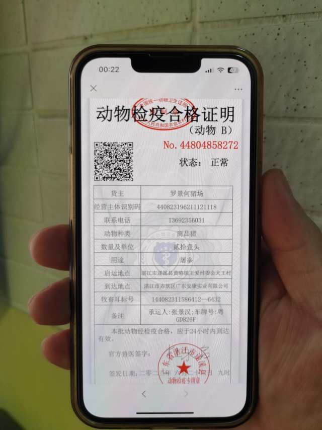 裝車(chē)完畢,養(yǎng)殖場(chǎng)不再需要前往鄉(xiāng)鎮(zhèn)的動(dòng)物檢疫申報(bào)點(diǎn)領(lǐng)取紙質(zhì)檢疫證明,憑著提取碼即可獲取檢疫證明電子證照。獸醫(yī)的上門(mén)檢疫服務(wù),檢疫證明的無(wú)紙化,讓養(yǎng)殖場(chǎng)切切實(shí)實(shí)感受到了前所未有的便捷?!熬W(wǎng)上申報(bào)、網(wǎng)上受理、現(xiàn)場(chǎng)檢疫、電子證照”的檢疫模式,徹底打通服務(wù)養(yǎng)殖場(chǎng)戶“最后一公里”。