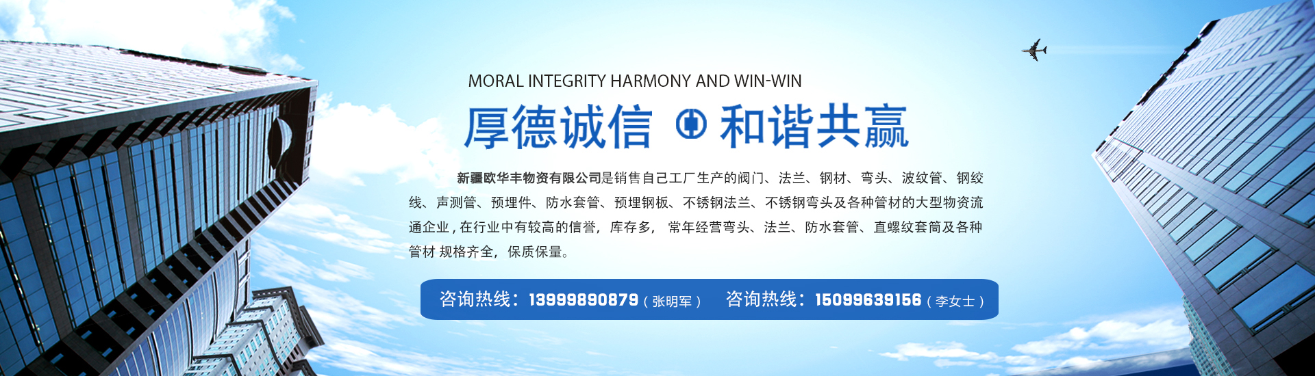新疆歐華豐物資有限公司是銷(xiāo)售自己工廠(chǎng)生產(chǎn)的彎頭 法蘭 防水套管 及各種管材的大型物資流通企業(yè) , 在行業(yè)中有較高的信譽(yù),庫(kù)存多,常年經(jīng)營(yíng)閥門(mén)、法蘭、鋼材、彎頭、波紋管、鋼絞線(xiàn)、聲測(cè)管、預(yù)埋件、防水套管、預(yù)埋鋼板、不銹鋼法蘭、不銹鋼彎頭及各種管材 規(guī)格齊全,保質(zhì)保量。 公司一貫以: 服務(wù)上乘、質(zhì)量?jī)?yōu)質(zhì)、價(jià)格合理、客戶(hù)至上、服務(wù)周到、讓利客戶(hù)、薄利多銷(xiāo)為原則,誠(chéng)實(shí)守...